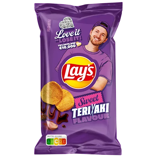 Lay’s Max Sweet Teriyaki er ekstra sprøde chips med en lækker, sød og krydret teriyaki-smag. Perfekt til dig, der elsker asiatisk-inspirerede snacks med masser af smag.